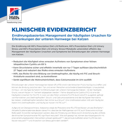 1Kruger JM, Lulich JP, MacLeay J, et al. Comparison of foods with differing nutritional profiles for long-term management of acute nonobstructive idiopathic cystitis in cats. J Am Vet Med Assoc. 2015;247(5):508-517.